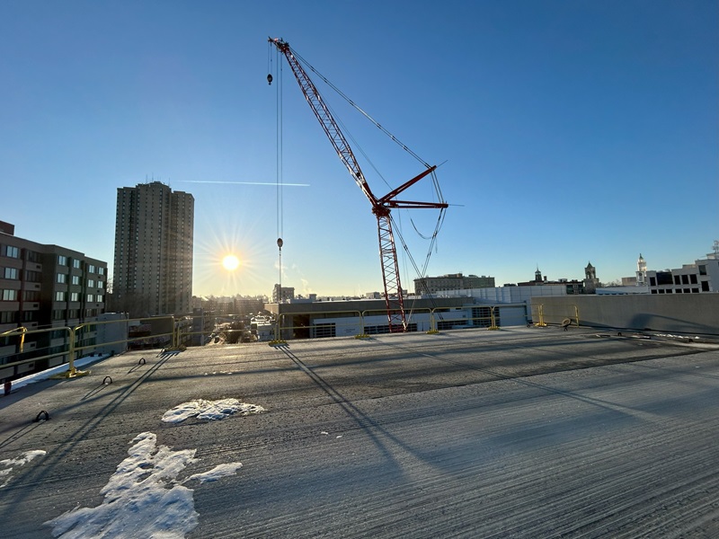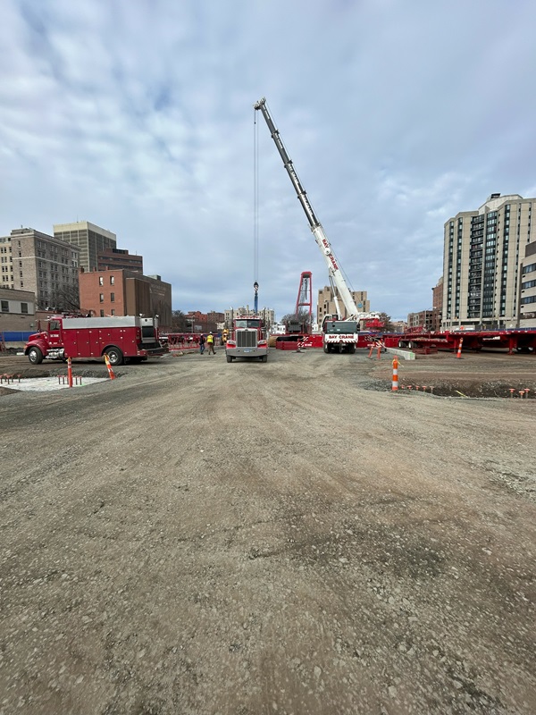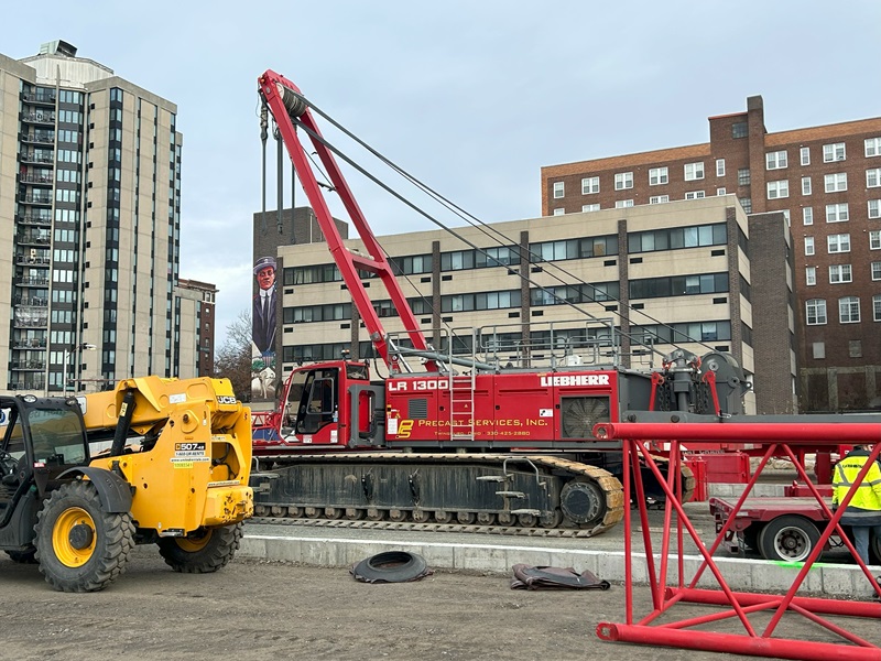 Completing the precast erection on schedule required strategic planning to overcome a number of challenges. Working in a busy downtown area meant limited site space, as the MassMutual Center remained open to the public during construction. The limited working space for our team led to our 330-ton precast crane being disassembled directly on Bruce Landon Way, the main street entrance to the civic center, adding fuel to the already busy working environment. In addition, the frigid temperatures of a New England winter, made the precast erection activities even more challenging than they already were for our team and partners. Despite these obstacles, our team’s precision, adaptability, and commitment to safety ensured that we met our deadlines and delivered high-quality results.